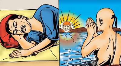 One must resolve not to eat much, or sleep long hours or wallow in pleasures and instead eat less and sleep less and abide by Baba's words of prudence and guidance.Even though we possess abundant wealth, we should do all our works on our own and never depend on others. However, if we pamper the body and accustom it to luxuries and pleasures, life becomes futile. But, the body should neither be neglected nor loved too much. We must just take as much care of the body as a horse-rider takes care of his horse till the destination is reached. We should ensure that the body is cared for as a befitting instrument for Self-liberation. Indeed, it is a great boon to beget human birth. And we are doubly fortunate to have the opportunity of getting self-liberated by serving and adoring the Feet of Sainath.